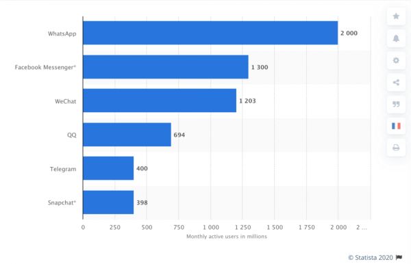 图注:WhatsApp及Facebook Messenger是全球排名第一及第二的即时信息应用程序(来源:Statista)