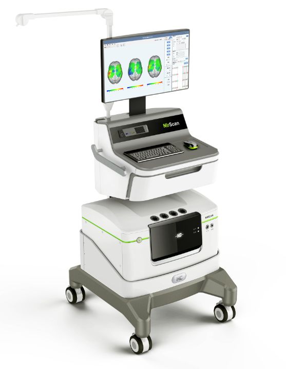 近红外脑功能成像(fNIRS)是一种较为新颖的脑功能技术,相较于脑电EEG、功能核磁共振fMRI、核素成像PET等传统脑功能成像技术具有空间定位能力强、使用快捷、无创、生态效度高、对运动伪影/电磁干扰不敏感等诸多优势,能够在患者运动、说话、治疗等状态下完成高分辨脑功能定量检查和评价。