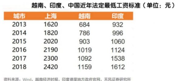 2019年的越南官方数据显示,越南一类地区最低工资标准为月薪 428 万越南盾(约 1261 元人民币),二类地区 371 万越南盾(约 1114 元人民币),三类地区 325 万越南盾(约 981 元人民币),四类地区 292 万越南盾(约 875 元人民币)[7]。