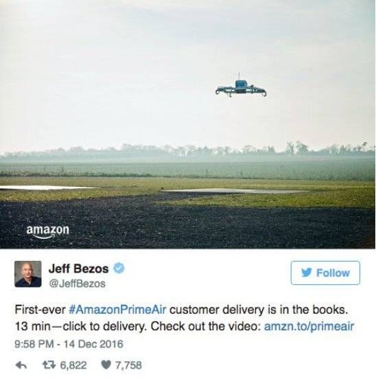 2013年,亚马逊开始测试送货无人机,目标是在30分钟或更短的时间内将包裹送到客户家门口。不过,鉴于当时美国物流和法规问题,许多媒体认为贝索斯只不过是在宣传作秀,为了省去几百万广告费。