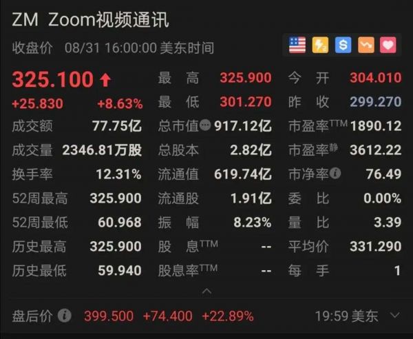 财报显示Zoom二季度实现6.635亿美元总营收,归属于公司普通股股东的净利润为1.857亿美元,营收和利润超出市场普遍预期,令该公司股价盘后大涨超20%,妥妥的成为今年新冠疫情的受益股。截至异观财经发稿,Zoom总市值917.12美元。
