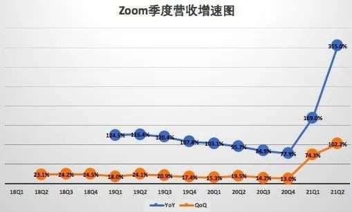 财报数据显示,2021财Q2,Zoom总营收6.635亿美元,较上年同期1.458亿美元,增长355%,较上一季度的3.282亿美元,增长102.2%。这是Zoom自2019财年以来,季度营收同比、环比增速的双双创历史新高。