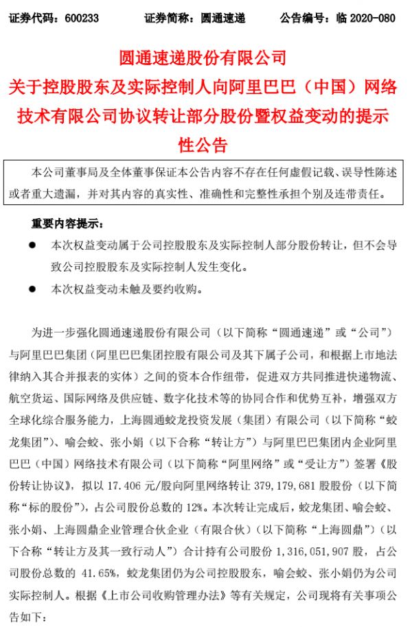 9月1日晚间,圆通速递发布公告称,公司控股股东及实际控制人已向阿里巴巴转让部分股权。本次转让的股份占公司股份总数的12%,转让价格为17.406元/股,转让价格总计约合66亿元。