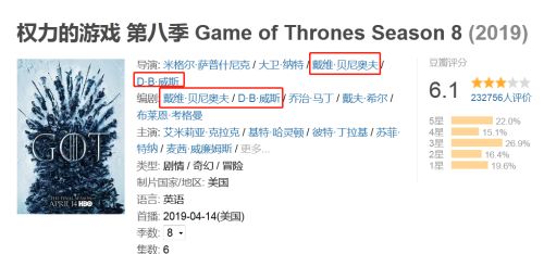 这下2DB领衔操刀,又让人梦回权游最终季烂尾的心碎时刻,如今,权游第八季在豆瓣的评分已在及格边缘徘徊,与前七季平均9.4分的差距不是一般的大。