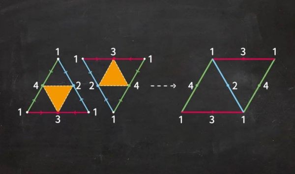 如上图左边所示,当我们想要将正三角形恢复成正四面体时,只需将颜色相同的边对着粘合即可;而要将两个展开图形结合,则只需将其中一个旋转180°,再将它们拼在一起即可(如上图右所示)。如果继续向各个方向无限地进行这种结合,就能将这些图形密铺到整个空间。