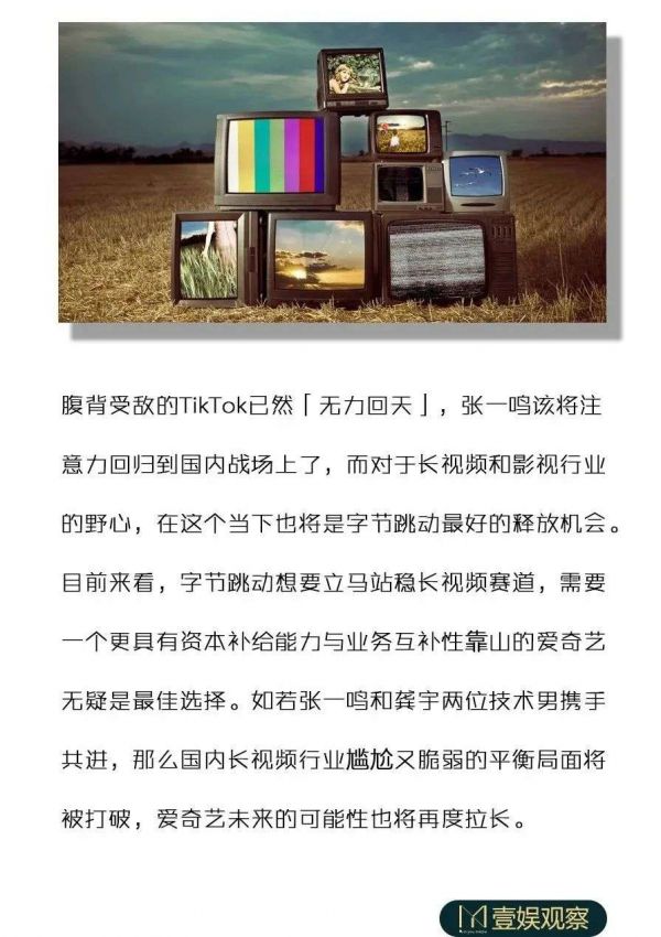 在《为什么支持字节跳动而不是腾讯拿下爱奇艺?》一文中壹娱观察(ID:yiyuguancha)阐述了关于字节跳动应该与腾讯竞价拿下爱奇艺的提议,并提出了一个观点:“一旦最近TikTok真的开始面临全球化受阻的问题,字节跳动则更需要在国内市场开拓出一片领域,为其千亿估值提供更多的想象力。”