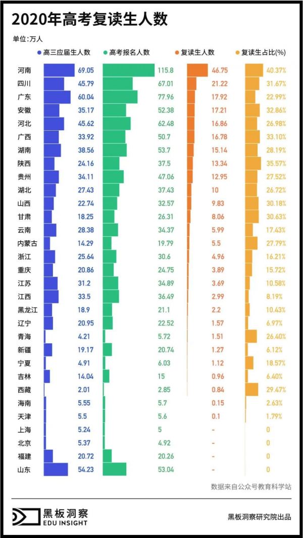 2020年,全国高考报名人数为1071万,根据互联网数据推算,其中复读生总数超过200万,单河南省的复读生就达到46.75万人,占河南报考总人数的40.37%。纵观其他省份,15个省复读生占高考报名总数的比例超过20%。
