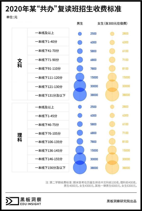 但是,由于民办复读学校并不普及或学生及家长对私立复读学校的不完全信任等原因,相当数量的公办名校会通过挂靠、分校等方式招收复读生,复读班一般为民办性质,但会通过公办校名称来招揽生源。有消息称,国内某著名公办校就与社会资本共同成立了民办性质的中学,以下为其“共办”的补习中心复读班招生收费标准。
