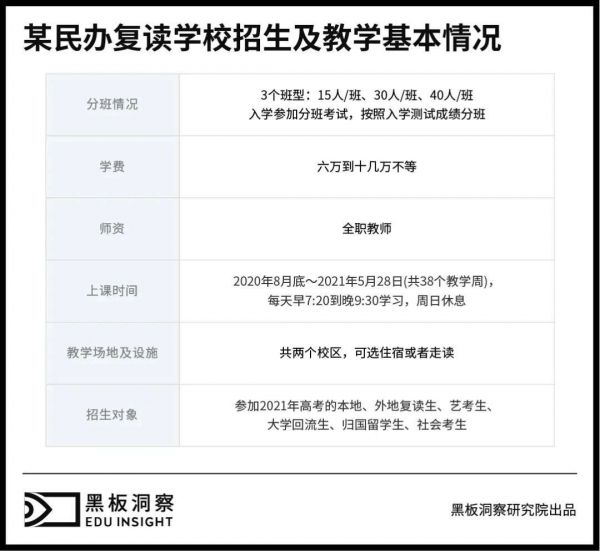 复读群体的壮大加之公办校招收复读生的种种限制为私立复读学校提供了生长的土壤。民办复读学校包含专门的复读学校(部分复读学校除高考复读外还兼有其他教培业务)或者培训机构开设的复读培训中心,此处讨论的主要是前者。以下为某私立复读学校招生及教学基本情况。