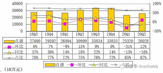 陌陌2020年第二季度直播服务营收26亿元,与上年同期的30.999亿元相比减少16%,较上一季度的23.3亿元增长12%。