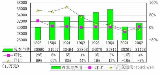 2020年第二季度,不按照美国通用会计准则计量,成本和支出为29.237亿元(约4.138亿美元),比上一年同期的28.667亿元增长2%。