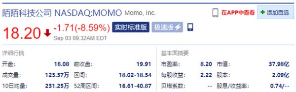 陌陌开盘跌9.19% 二季度营收不及市场预期