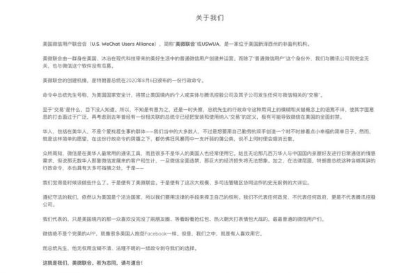 美微联会主席曹英律师则对新浪科技强调,美微联会代表的是一群身在美国的普通微信用户。“我们代表的,只是美国境内一群喜欢刷朋友圈,盼着抢红包,打表情包大战的最普通微信用户……除了‘普通微信用户’这个身份外,我们与腾讯公司完全无关。美微联会与任何政党、政府、或腾讯控股公司及其相关机构均无任何利益关联。”
