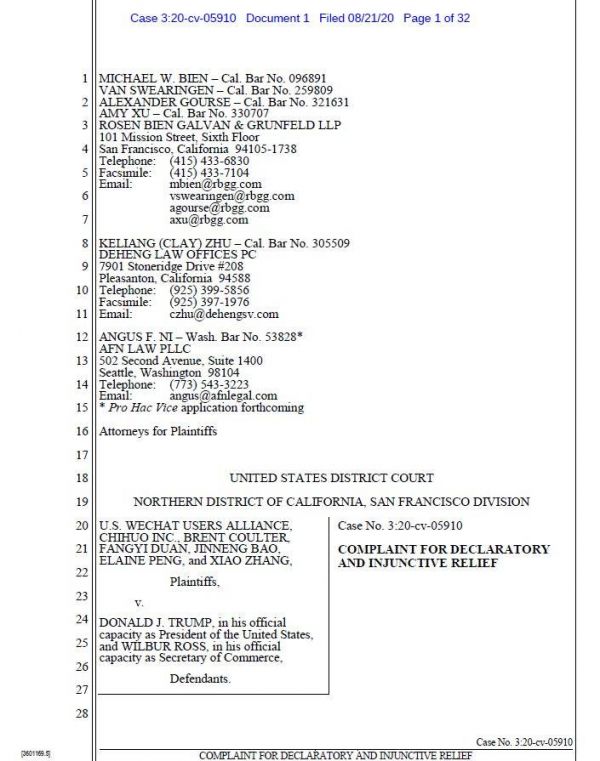 8月28日,美微联会正式向法庭提出禁止令申请,请求法官下达禁令,阻止特朗普的微信封杀令生效。曹英律师对新浪科技解释说,由于诉讼程序需要时间,只有在8月底提交禁止令申请,才可能让法院在9月中旬及时召开听证会,尽量在总统命令生效之前阻止白宫封杀微信。“我们不想美国微信用户受到禁令影响,不想美国微信用户和亲友失联。”