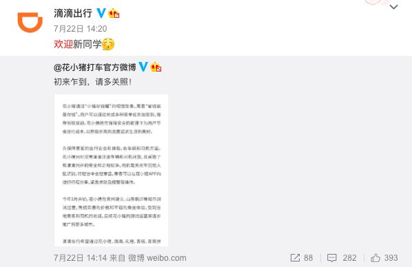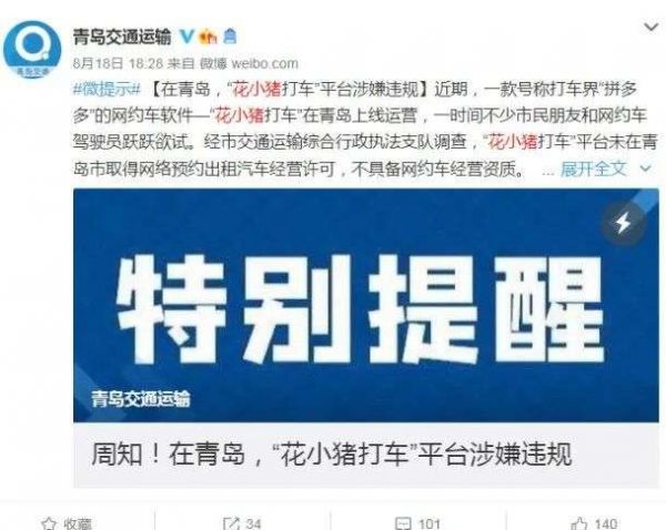 据网上公开信息,8月18日@青岛交通运输官微发文称,“花小猪打车”平台涉嫌违规,未在青岛取得预约出租汽车经营许可,不具备网约车经营资质。