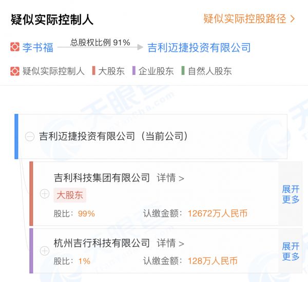 吉利迈捷投资有限公司什么来头?澎湃新闻查询股权结构资料发现,吉利迈捷投资公司由吉利科技集团有限公司持股99%、吉利科技集团的全资子公司杭州吉行科技有限公司持股1%。吉利科技集团由李书福及其子李星星出资成立,在2018年12月由吉利集团有限公司更名而来。