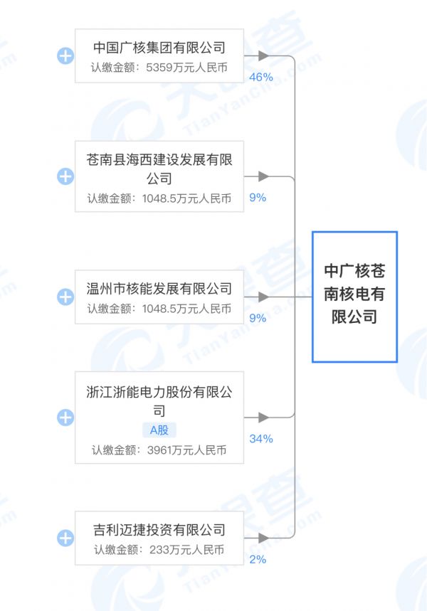 根据天眼查数据,中广核苍南核电有限公司共有五方股东:除了持股46%的大股东中广核集团之外,浙能集团所属的浙江浙能电力股份有限公司(浙能电力,600023)持股34%、温州市工业与能源发展集团旗下的温州市核能发展有限公司持股9%、苍南县国有资产投资集团全资控股的苍南县海西建设发展有限公司持股9%,另外还有,持股2%的吉利迈捷投资有限公司。