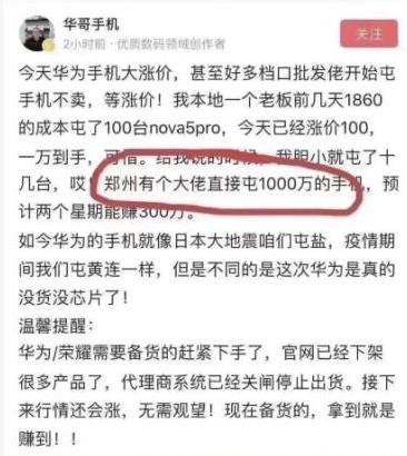 最近几天,很多代理商朋友圈中一直流传着这样的一张截图:一位手机代理商发了这样的一段话,“郑州有个大佬直接囤了1000万的(华为)手机,预计两个星期能赚300万”,“有个老板囤了100台nova5pro,今天已经涨价100,一万到手”。