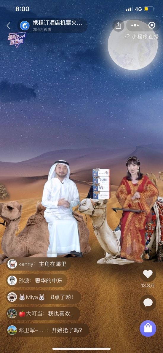从直播画面来看,梁建章和直播助理、携程集团副总裁孙天旭就像坐在骆驼上,背后或是沙漠,或是阿布扎比大清真寺。
