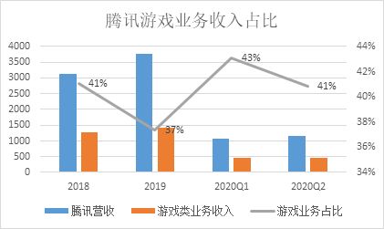 在这个季度,腾讯游戏板块的总收入达到469亿元,甚至超过了“全民宅家”的一季度。游戏业务在整体收入中的占比虽然有所降低,但仍然高达41%,是腾讯绝对的收入和利润担当。