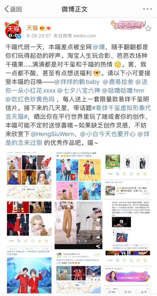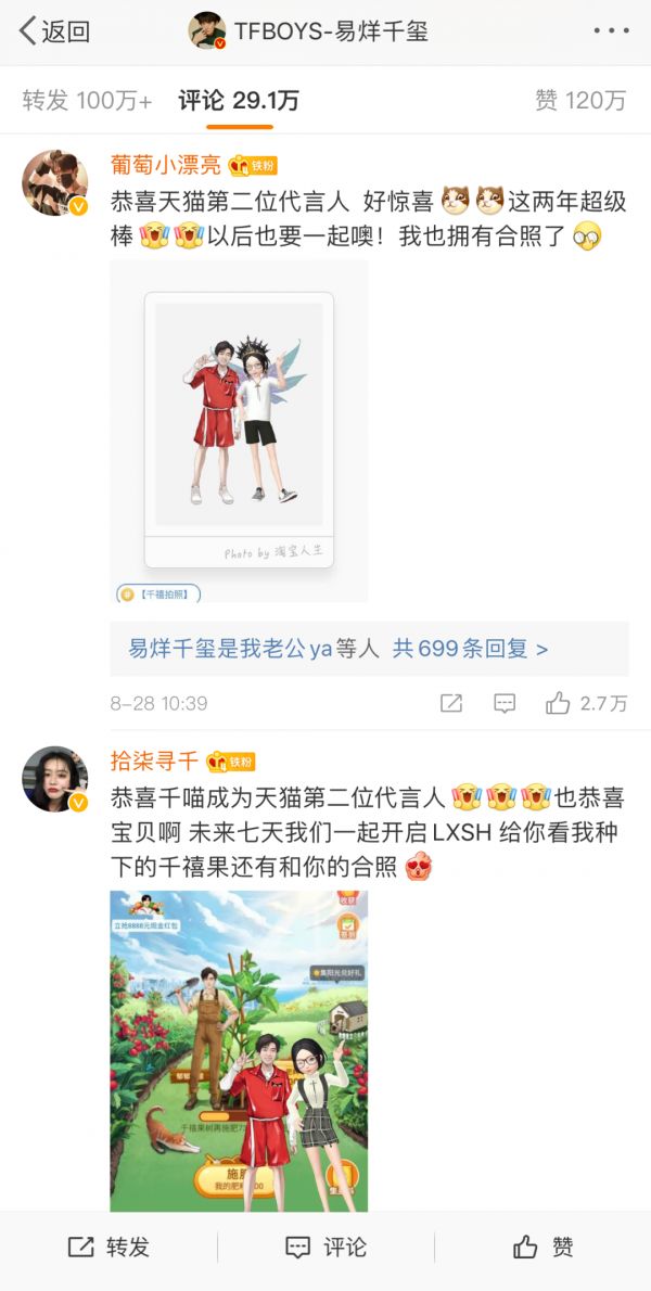 8月28日,天猫正式官宣千喵加入代言人阵容。当天,易烊千玺的粉丝们毫无意外地”攻陷”了天猫的官方微博。“本喵差点被全网@爆,随手翻翻都是你们玩得起劲的呼声”,在当天难发布的一条微博中天猫这样写道,粉丝们的热情甚至让见惯大场面的官微都有些招架不住。