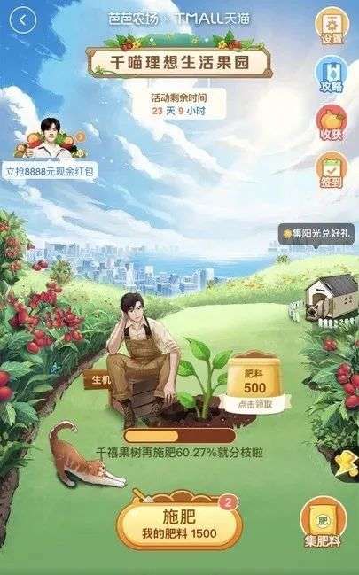 另外,千喵理想生活果园的项目则建立在芭芭农场这款产品的场景中。“芭芭农场”是阿里推出的一个虚拟农场,它的特殊之处在于用户通过辛勤的浇灌最终能够在现实生活中兑换好礼。这款产品的用户规模达到了3亿,其中近五成用户是以90后为主的年轻人。在千喵这轮营销活动中,粉丝们需要为千禧果施肥。最终,他们不仅能够获得真实水果的回馈,还能参与到公益助农行动中——每中一颗千禧果树,就能帮助山东省寿光市的农民卖出一箱千禧果,而打包千禧果的过程还能带动当地打包女工的就业。