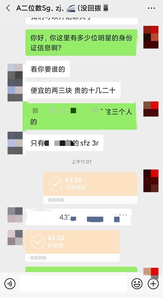 有人以3元钱的价格售某卖明星的身份证号。截图