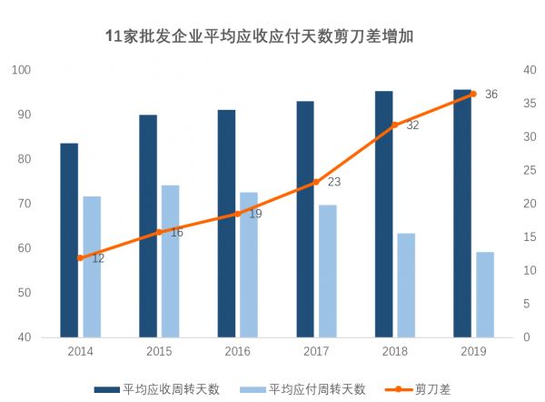 对于配送商而言,对医药的纯销业务比例扩大,调拨(分销)占比则因为“两票制”限制下降。这令“垫款者”的现金流压力进一步加大,原本可由下一级分销商分担的回款压力上移,11家上市医药流通企业平均应收应付天数剪刀差(根据wind数据整理),从2016年的19天提高到2019年的36天,上下游资金压力越来越大。