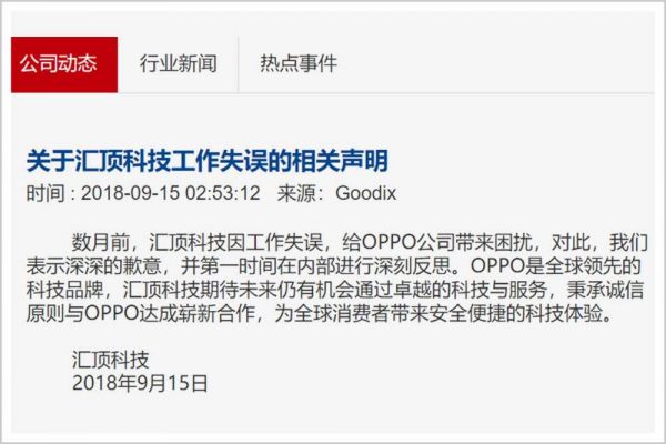 但拥有先进产品的供应商,又有谁能真的拒绝?汇顶在官网迅速对OPPO致歉之后,OPPO当月就表示,“对汇顶科技过去的工作失误表示谅解”。