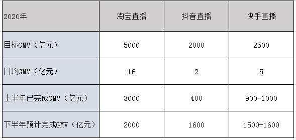 其中淘宝直播已完成3000亿元GMV;快手直播已于今年上半年完成去年底曾制定的「2020年电商达1000亿元」的目标,并于5月调高目标GMV至2500亿元,是2019年的近10倍。而抖音上半年只完成了400亿元,下半年仍背负很大的销售压力。