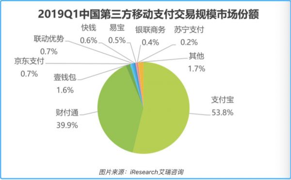 2019年Q1中国第三方支付交易规模市场格局,图片来自艾瑞咨询