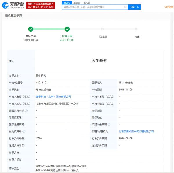 天眼查APP显示,9月5日,锤子科技(北京)股份有限公司申请的“天生骄傲”商标已经初审公告。该商标申请日期为2019年10月28日,申请注册号为41931191,国际分类为“35-广告销售”,当前商标状态显示为“等待实质审查”。