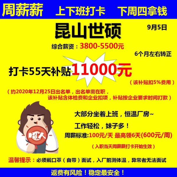 吴小杰发来打工网关于昆山世硕的招聘信息显示,通过此中介渠道进入的员工为“周薪薪”模式,“上下班打卡,下周四拿钱”,周薪标准为100元一天,最高领6天,综合薪资在3800—5500元(有的为5200—7000),6个月转正。而每一天的补贴(返费)都不一样,差价在上百到上千。