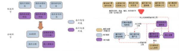 制造端的业务被分别装进A股和H股;分销端更是剪不断理还乱,其中KA渠道以及海外电商分销等外部零售渠道归属海尔智家,而用以开拓三四线渠道的日日顺体系(经销商、电商旗舰店等)则归属于海尔电器……