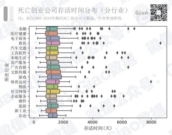 虽然人们常说创业无坦途,但是凡事就怕比较。我们也整理了不同行业创业公司生存时间情况(如下图),用来帮助新手村的各位找到最适合的练级方向。
