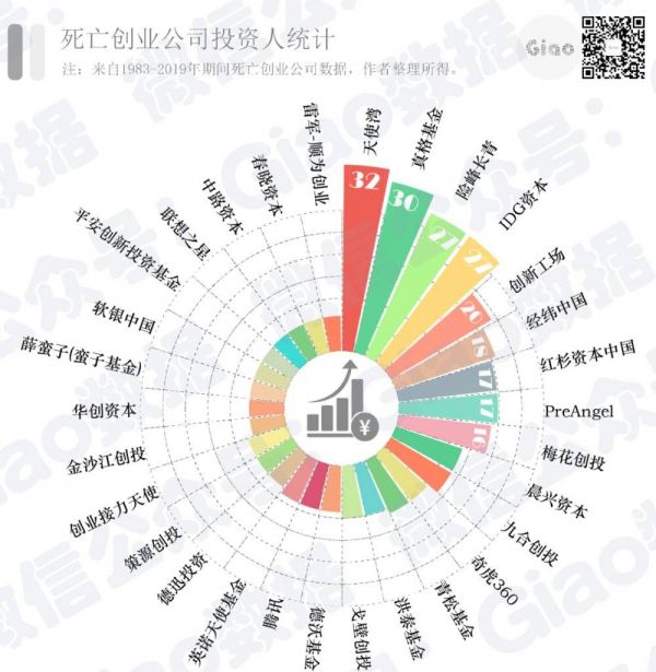 如图可见,天使湾(32)、真格(30)、险峰长青(27)的投资失败次数位于前列,失败次数最低的是雷军旗下的顺为创业以及春晓资本。