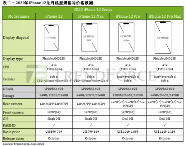 至于售价,iPhone 12(699美元-749美元)、iPhone 12 Max(799-849美元)、iPhone 12 Pro(1049-1099美元)、iPhone 12 Pro Max(1149-1199美元)。对于曝光的售价,供应链和郭明錤都表示,为了出货量,苹果不会显著调升iPhone 12的售价,而iPhone 12依然有极大可能延续5499元定价。