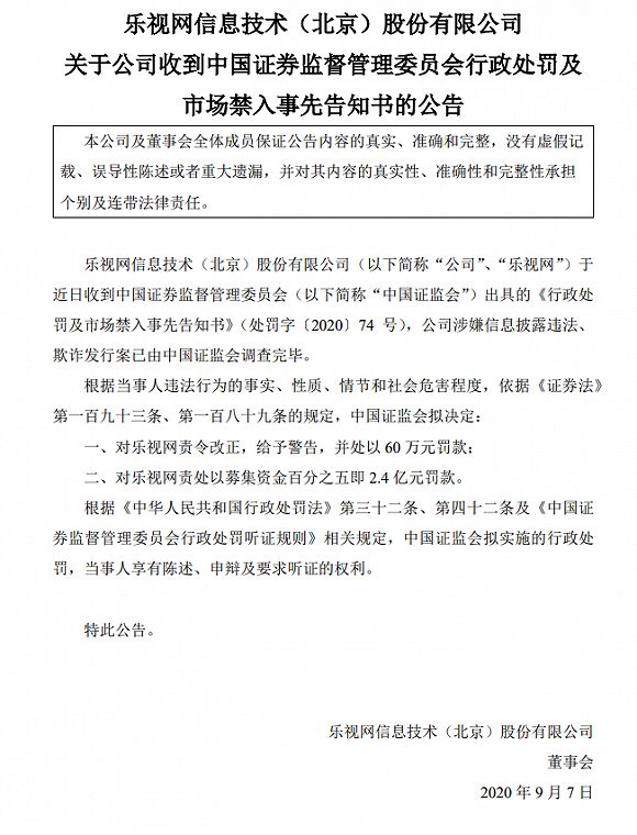 值得注意的是,本次《行政处罚及市场禁入事先告知书》中只提及了对乐视网的处罚。