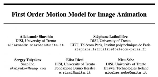 First order motion 模型来自顶会 NeurlPS 2019 上的一篇论文,《First Order Motion Model for Image Animation》(《用于图像动画的一阶运动模型》),作者来自意大利的特伦托大学以及 snap 公司。