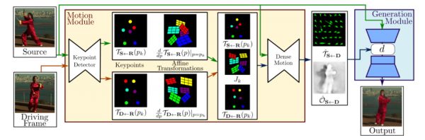 总的来说,该一阶运动模型的框架主要由两个模块组成:运动估计模块(motion estimation module)和图像生成模块(image generation module)。