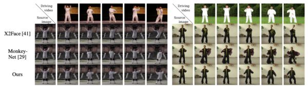 作者将其方法与目前该方向最先进的方法 X2Face 和 Monkey-Net 进行了对比,结果在相同的数据集中,本方法各个指标都有所提高,在两个人脸数据集(VoxCeleb 和 Nemo)上,本方法也明显优于最初提出用于人脸生成的 X2Face。