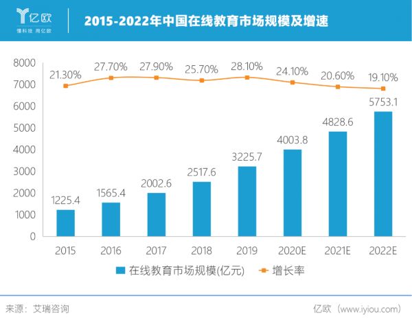 根据艾瑞咨询数据,2019年中国在线教育市场规模3225.7亿元,同比增长28.1%,预计未来三年市场规模增速仍将保持在19-24%之间。疫情期间,K12在线教育渗透率加速提升,预计将由2019年的10%上升到2020年的30%,在2023年将超过50%。