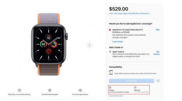 从入门级的40毫米和44毫米铝制表盘版本,到太空黑不锈钢版本,苹果手表五代美国、中国、日本、英国等国家的官方网店的库存量都很低。其中一些低价位版本注明无货,但是一些价格更高的型号则仍然有货。一些继续提供购买的五代苹果手表,显示发货日期已经到了九月底,这也表明库存量水平低。