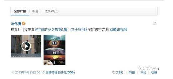 马化腾的最后一条腾讯微博,停留在2015年4月。内容是他从由腾讯视频推的一条关于宇宙时空的纪录片。