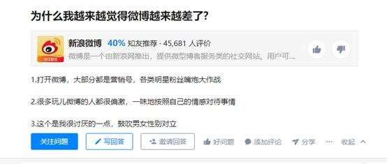 但反面,微博上“僵尸粉”“水军”“虚假点赞数量”等等也是“贩卖热度”下的恶性衍生品。当用户的评论、关注度都能够被当作一个商品来买卖时,用户对社区的反感度也会悄然滋生。