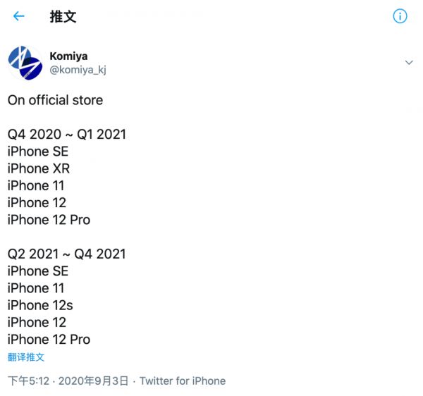 数码爆料达人Komiya表示,在今年第四季度iPhone 12系列发布后,苹果官网便会下架iPhone 11 Pro,而iPhone SE/iPhone XR/iPhone 11这三款旧机型会继续售卖,直至明年第一季度。