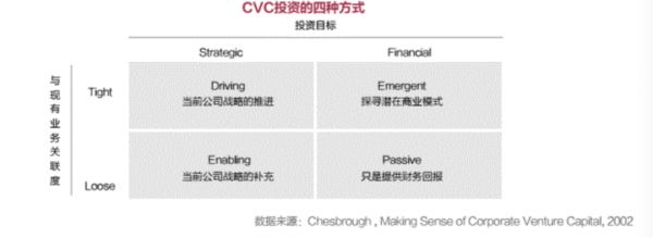 期权式投资(Emregent investment ):期权投资难以迅速提供回报,但能够给CVC母公司提供战略期权。母公司利用被投企业尝试新商业模式,进入新商业领域,开放新备用技术。