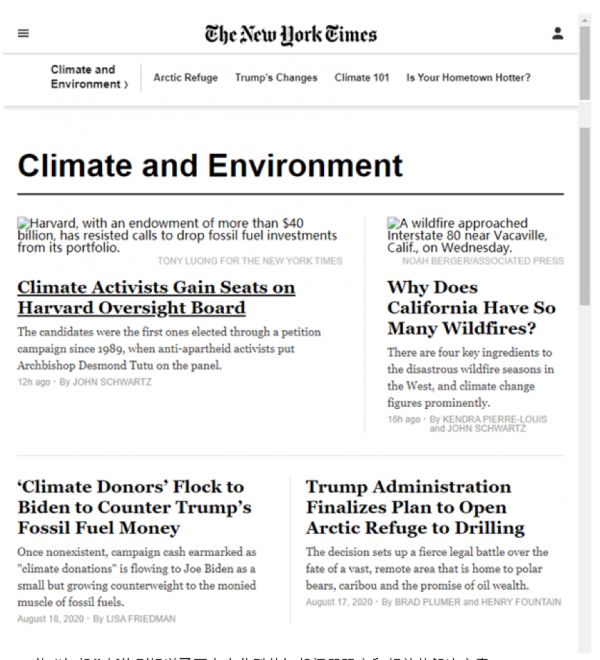 推行付费墙制度的《纽约时报》设置了免费向公众开放的“气候与环境”栏目,栏目下包含“气候基础知识”“你的家乡变热了吗”“极地避难所”等类别标签;