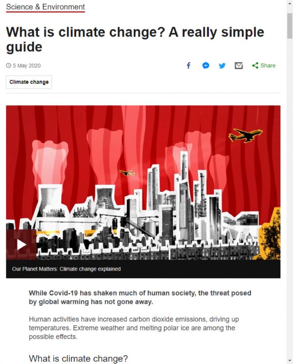 BBC的气候报道包含于“科学与环境”栏目之下,目前正在逐步科普气候变化的相关知识,在5月份发表了一篇《什么是气候变化?一个非常简单的指南》的入门型科普文章……