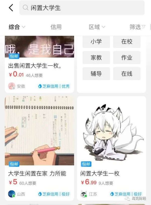 撇开之前舆论热议的“原味”、“洗抽油烟机”等不谈,试着在闲鱼随意搜索“作业”一词,可得到排名结果第一的“闲置大学生一枚”,卖家提供的业务有作业辅导和习题辅导。